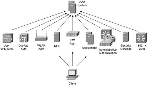 In this deployment, the AAA server is the master repository for all user identity credentials (hence, the name root server). All systems in need of AAA services act as clients to the AAA system. This concept is shown in Figure 9-1.