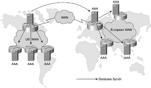 Vendors differ in their approach to AAA server synchronization. Some offer a peer-to-peer system, while others operate a master-slave relationship similar to DNS. In either case, the replication of the data on multiple AAA servers is critical. The three factors that impact this replication are as follows: