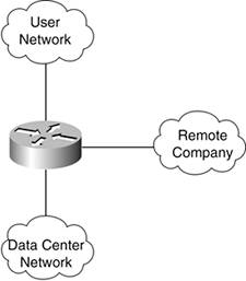 Let's consider a very basic example. Suppose you must provide connectivity between a data center, a group of users, and a remote company accessing your network over an extranet connection. Without thought to security, your network design might resemble the network shown in Figure 1-2.
