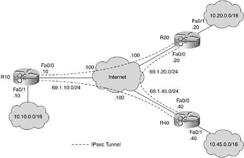 Figure 10-29 shows the topology for this design. It is a small, three-site, full mesh IPsec network. Each location houses a /16 IP range in the RFC 1918defined 10.0.0.0/8 network. Traffic from each location's local LAN to either of the other two sites' local LAN is encrypted.