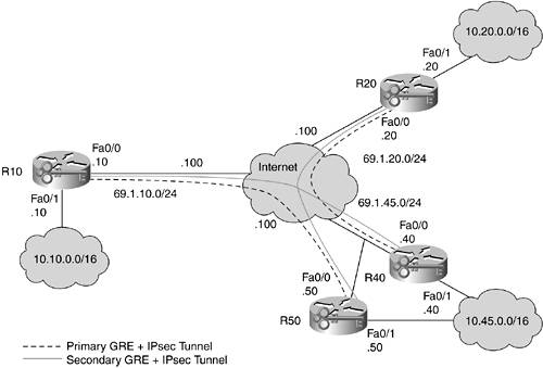 All intersite routing is static because GRE tunnels are not used. All IPsec traffic is encrypted and authenticated with ESP tunnel mode (Figure 10-6).