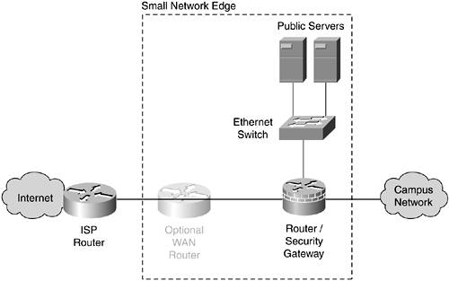 As you can see, the small network edge compresses the essential network security elements into a single security gateway. Dividing functionality into different devices doesn't make financial sense in a network of this size. As a result, careful attention must be paid to the integrity of the gateway's configuration. Manageable systems are a key element in this design because, with as many functions as you will configure on this one device, mistakes are likely.