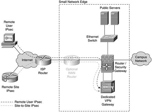 Now that you have seen the security roles on the devices in the small network edge design, this section presents the VPN elements. Figure 13-2 shows the termination points for site-to-site and remote user VPNs. In this design, both terminate on the security gateway directly.