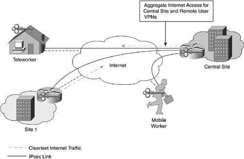 A mobile worker, for example, encrypts all communications to the central site and the Internet at large and sends it to the central site. |
