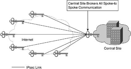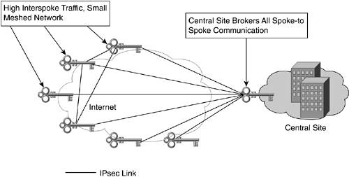 Full mesh is clearly the least scalable, most expensive, and most difficult topology from a configuration standpoint. Dynamic routing and digital certificates should be considered requirements for any full-mesh IPsec network greater than approximately five peers. From a hardware standpoint, each site must have the same capabilities in its IPsec gateways. As the number of sites expands, the requirements on the routing protocol grow just like in any other fully meshed network.