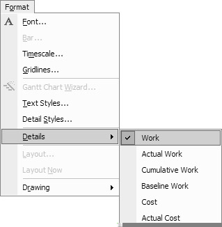 By default, the timeline pane describes Work (total person-hours) for each task. Add another Detail field by right-clicking any cell in the Details column, or by clicking Format Ø Details on the menu and then choosing another field.