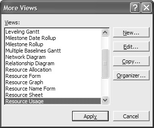 Understanding and using the standard views described so far can be daunting, especially for a new user. But the true Microsoft Project expert wants more--and Project has more to give! Select View Ø More Views to see additional view selections. If the available list doesn’t contain exactly what you’re looking for, you can create your own view. See “Creating and Saving Views” later in this chapter for more information.