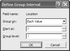 To group by only a particular level of the selected outline code, click the Define Group Intervals button to display the Define Group Interval dialog box. Pull down the Group On list, and select Level; then select the outline code level from the Group Level list that you want to group on. Click OK to return to the Customize Group By dialog box.