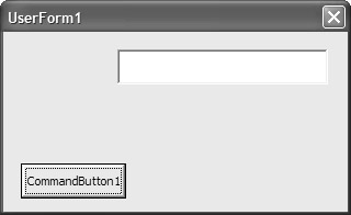 Each control on a form has its own capabilities, and can be coded to operate independently of everything else on the form. Consider again the OK button that you find in almost every dialog box. To create an OK button in VB, you simply click the CommandButton tool in the Toolbox, drag the cursor to the form, and drop it in. This procedure creates a button called CommandButton1, as shown in Figure 26.5. Note that the Project Explorer window is now set to your new UserForm, and the Properties window is displaying properties for the CommandButton you have just added.