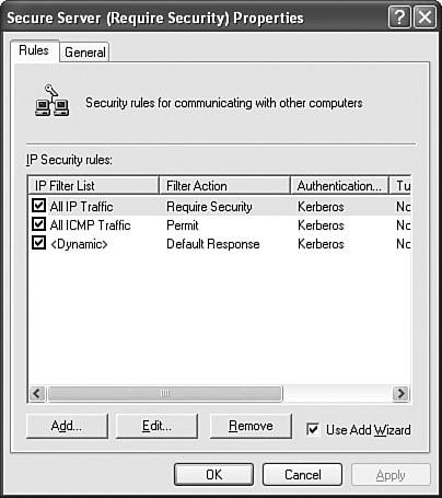 Figure 11.16. You can view, add, change, or remove rules surrounding IPSec.  | 11. | On the Rules tab, Click the All IP Traffic under IP Security Rules, and then click the Edit button.
