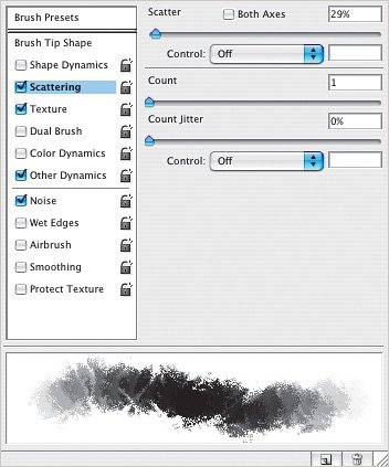 If you want, you can also try other settings to see the effect it has on your brush. Here, I chose Scattering and adjusted the settings.