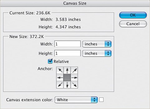 Step Two. | From the Image menu, choose Canvas Size (or press Command-Option-C [PC: Control-Alt-C]). In the Canvas Size dialog, make sure the Relative checkbox is turned on and enter 1 inch in both the Width and Height fields.