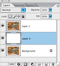 Step Three. | Press-and-hold the Command key (PC: Control key) and click on the Create a New Layer icon at the bottom of the Layers palette to create a new layer below the current layer. Press D to set your Foreground and Background to the default colors. Then press Command-Delete (PC: Control-Backspace) to fill the new layer with white.
