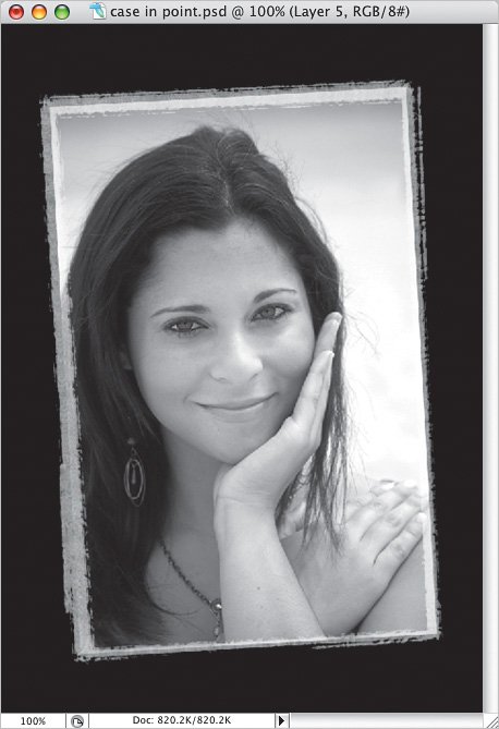 | Step Two. | Click on the top layer to make it active and then press Command-T (PC: Control-T) for Free Transform. Move your cursor just outside the corner transform handles until you see the Rotate cursor, click-and-drag to rotate the photo slightly, and then press Return (PC: Enter). In my example, I pressed D to set the Foreground and Background to their default colors, clicked on the Background layer, and pressed Option-Delete (PC: Alt-Backspace) to fill it with black. Or, with the Background layer active, you could click on the Create a New Layer icon (at the bottom of the Layers palette) to add a new layer above the Background layer, and then fill that new layer with black.