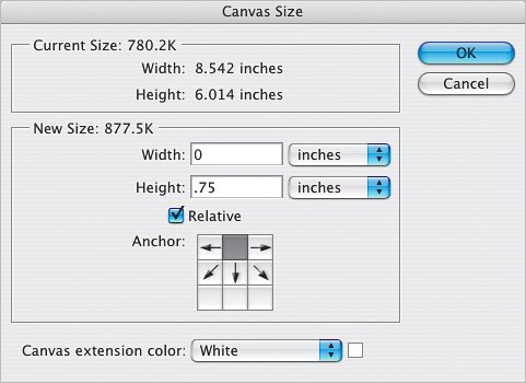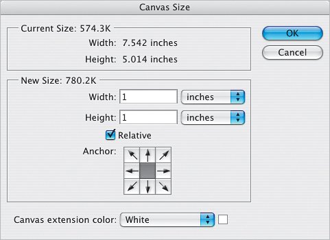 | Step Two. | From the Image menu, choose Canvas Size (or press Command-Option-C [PC: Control-Alt-C]). Make sure the Relative checkbox is turned on and add 1 inch to both the width and height (or more if you prefer).