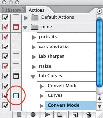 | | | Step Seven. | Once the action has been recorded, you can leave it as is so that it runs automatically with these settings, or click to the left of the Curves step in the Action, which will cause the Action to pause and open the Curves dialog for you to tweak the settings.