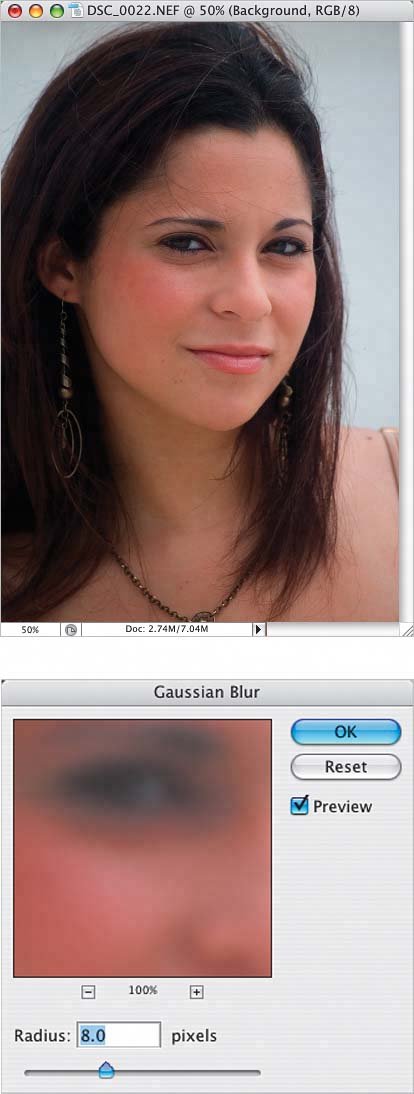 | Step Three. | You could stop at Step Two, but if there are details in the photo that look a little too blurry, you can add a layer mask and hide some areas of the blurry layer. Here I clicked on the Add Layer Mask icon at the bottom of the Layers palette to add a mask to the blurry layer, and pressed D, then X to set my Foreground to black. Then, I got the Brush tool (B) and painted with black over her eyes, lips, and hair. You could also paint with gray to slightly lower the opacity of the blurry layer.