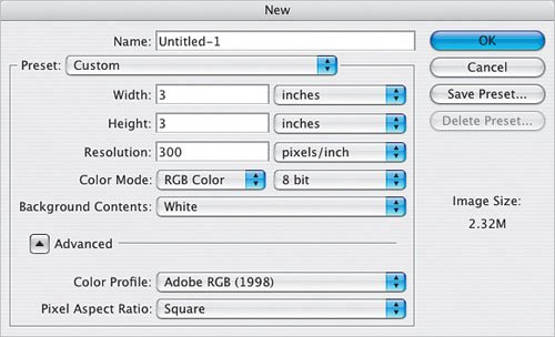 layer styles   Step One. | Create a new document (press Command-N [PC: Control-N]) that is both physically larger and a higher resolution than you think you'll need. (Better to end up with a graphic that's too big that you can scale down, rather than one that's too small.) In my example, the document is 3x3" at a resolution of 300 ppi.