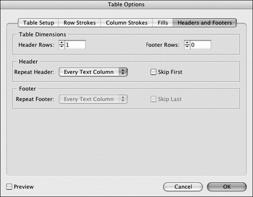 #45. Adding Headers and Footers to Tables For a table to be useful, it generally needs row and column headingsso you know what information is in them. This is easy to accomplish with a row at the top of the table containing column headings and a column down the left containing row heads. A problem occurs, however, if the table is split across several columns, text frames, or pages. The column heads become separated from their columns, leaving the reader to guess what's in them. Fortunately, InDesign provides a simple solution with its header rows feature that automatically repeats the necessary rows whenever the table splits. In addition, if you need a footer in the table (to contain a disclaimer or source, for example), footer rows can repeat as well. In the sample table (Figure 45a), the first row is designated as a header. So if we add 20 more steakhouses and need to continue the table on another page, the column heads will repeat. The last row is designated as a footer, so it will repeat as well. Figure 45a. In this table, the first row is a header and the last row is a footer. These rows will repeat as necessary if the table flows across pages. Creating Header and Footer Rows You have two choices for creating header and footer rows: You can convert existing rows, or you can add new rows. Converting Rows: If you realize that a table needs to continue in a different column, text frame, or page after you've created and formatted the entire table, you can convert the rows containing the header and footer information into actual header and footer rows. To do this, select the rows containing the header or footer information. (Using the Type tool, click outside the table when the arrow pointer displays.) Choose Table > Convert Rows > To Header or Table > Convert Rows > To Footer. If you're using both headers and footers in a table, you'll have to convert the rows separately. Adding New Rows: To add new rows for headers and footers, choose Table > Table Options > Headers and Footers. In the Headers and Footers panel (Figure 45b), enter the number of header rows to add in the Header Rows field. Enter the number of footer rows to add in the Footer Rows field. Figure 45b. The Headers and Footers panel lets you add header and footer rows to the selected table and control how often the rows repeat.  Headers and Footers Options: Whether you convert existing rows or add new headers and footers, you can control how often they appear in the Headers and Footers panel. Use the Repeat menus to specify whether the row should appear every time the table flows to a new column, to a new text frame, or only to a new page. If the start of the table contains column headings or footer information in a different format, such as a graphic, you can remove the header and footer from the start of the table. To do this, click Skip First in the Header area and/or the Footer area. If you change your mind about header and footer rows, you can select the rows and delete them or decrease the number of Header Rows or Footer Rows in the Headers and Footers panel. Converting Headers and Footers to Body Rows If you decide you no longer need information in a header or footer row to repeat, but you want to keep it in the table, you can convert it back to a body row, or standard table row. To do this, select the rows and choose Table > Convert Rows > To Body. |