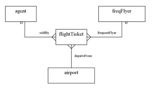In this example, the central table is flightTicket. All flight tickets originate from an airport but only some of them were sold by an agent and only some of them involve passengers with a frequent flyer account (freqFlyer):