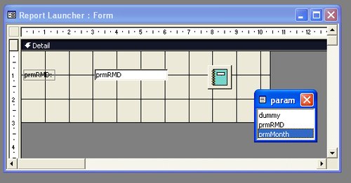 At this stage, you have built the report mnthRMD based on a query of the same name. The values shown in the report are controlled by the values set in the param table. You now have a working system and you can stop here. However, the finishing touch is to create a form to launch the report (see Figure 8-4).
