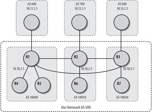 Figure 10-4 shows a network on which we'd like to use confederacies . AS 500 has seven BGP routers: R1, R2, R3, R4, R5, R6, and R7. If we didn't use confederacies, all seven routers would have to be fully meshed, or we would have to use route reflectors. In this network, route reflectors would be a problem: we would need more than one reflector, and managing them could easily get out of control. However, we can use confederacies to make a more manageable network. They are particularly important for large ISPs, but can also be useful for very large corporate networks.