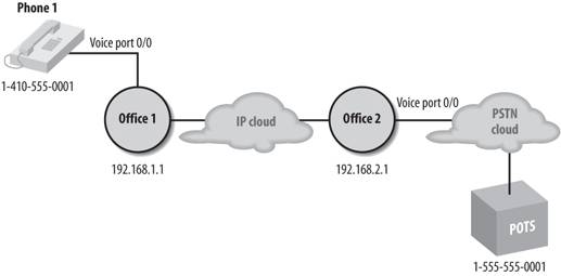 This example provides a way for our VoIP users in Office 1 to reach PSTN users at Office 2, which is outside their VoIP network (see Figure 6-4). Office 1 has a VoIP phone, which is assigned the number 1-410-555-0001. Office 2's router is directly connected to the PSTN via an FXO interface. The phone we want to be able to connect to at Office 2 has a phone number of 1-555-555-0001. With this configuration, the VoIP phone can call the POTS phones in Office 2 using the IP connection between the two routers, and vice versa.