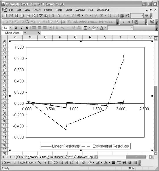 As an illustrative example, consider the data shown in Figure 8-12 along with the linear and exponential trendlines. The residuals between the linear fit and the exponential fit are plotted in Figure 8-14.