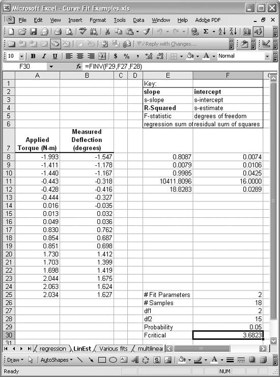 Figure 8-15 shows an example linear curve fit using Excel's LINEST function (see Recipe 8.3). The results of using LINEST on the given dataset are contained in the cell range E8:F12. I've included a key explaining what each returned value represents. The value in cell E11 is the F-statistic computed by LINEST.