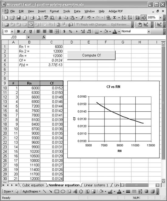 When you click the button in Excel now (with design mode off), it will execute the custom subroutine, computing Cf values over the desired RN range. You'll also see the results displayed in the table and on the chart. Should you decide you want to compute new Cf values over a different range of RN values, you need only enter the new range in cells C1 and C2 and press the button again.