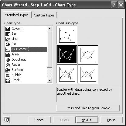 The right side of the Chart Wizard contains images of available sub-types for each major type of chart. XY charts have the five sub-types shown in Figure 4-2. The images are fairly representative of the sub-types. The choices here include simply plotting data points, plotting points with smoothed lines passing through them, plotting just the smooth lines, plotting points with straight line segments passing through them, and plotting just the straight line segments. I've selected smooth lines with point markers for this example.