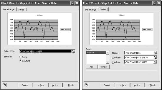 I included two views of the step 2 dialog box in Figure 4-3. The one on the left corresponds to the Data Range tab , while the one on the right corresponds to the Series tab .