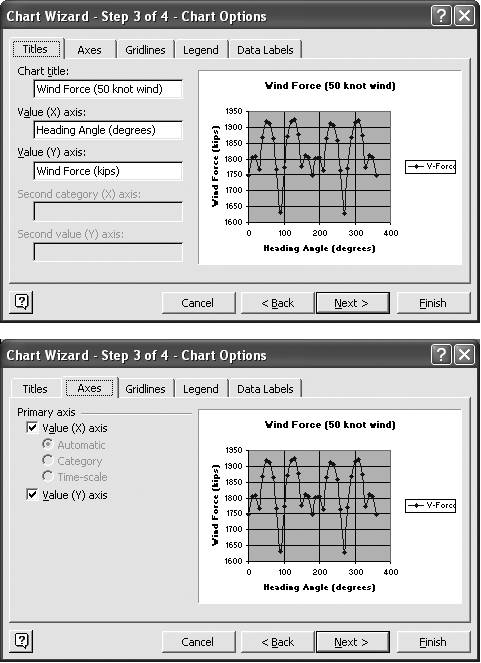 Figure 4-4. Chart Wizard: Step 3, Titles and Axes tabs