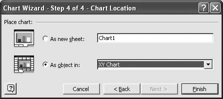 If you choose to place your chart on its own sheet, then you can specify the name of that sheet in this dialog box. The drop-down list next to the "As Object in" radio button allows you to select into which worksheet you want to embed your chart.