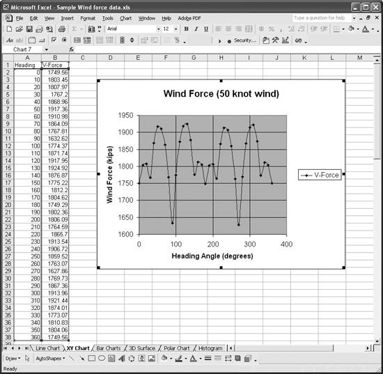 This is a good example of the sort of data that can be plotted on an XY chart. Basically, the heading data represents abscissa (x-axis) values, while force data represents ordinate (y-axis) data. Plotting the data should reveal how the wind force varies with heading.