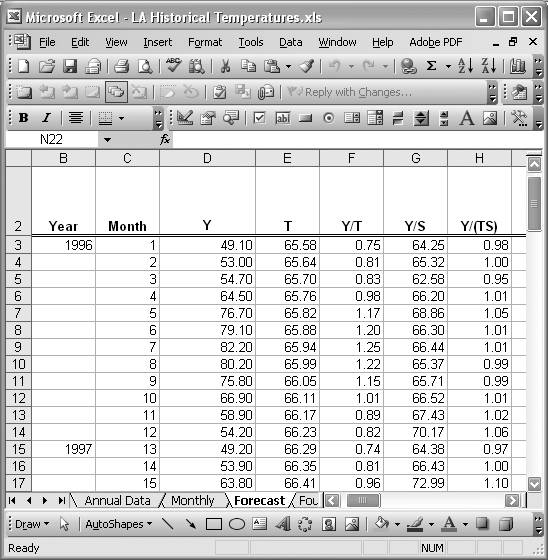 Deseasonalization is carried out in a similar manner. However, here we divide the original series, Y, by the seasonal index for corresponding months. For example, the first cell in column Y/S, cell G3, contains the formula =D3/Jan. Jan is a name I defined for the January seasonal index computed in the previous recipe. Likewise, the formula in cell G4 for the month of February 1996 is =D4/Feb. I named all the seasonal indices in this manner and each monthly Y in each year is divided by the corresponding seasonal index. The results are contained in column Y/S and represent the deseasonalized series. Figure 6-27 shows the resulting deseasonalized temperature series.