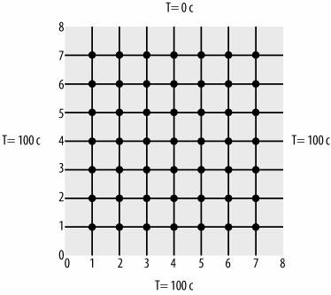 By way of example, consider the steady state temperature distribution in a square plate. The left, right, and bottom edges of the plate are maintained at a constant 100°C, whereas the top of the plate is maintained at a constant 0°C. The temperature distribution in the interior of the plate is governed by the Laplace equation shown earlier, where u represents temperature. The Laplace equation is repeated here for convenience: