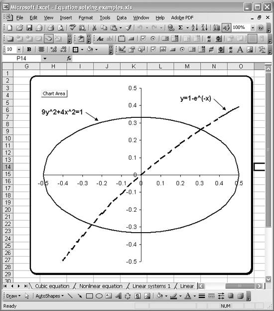 You can use the same Solver-based techniques discussed in Recipe 9.4 to solve systems of nonlinear equations. By way of example, consider the two equations: