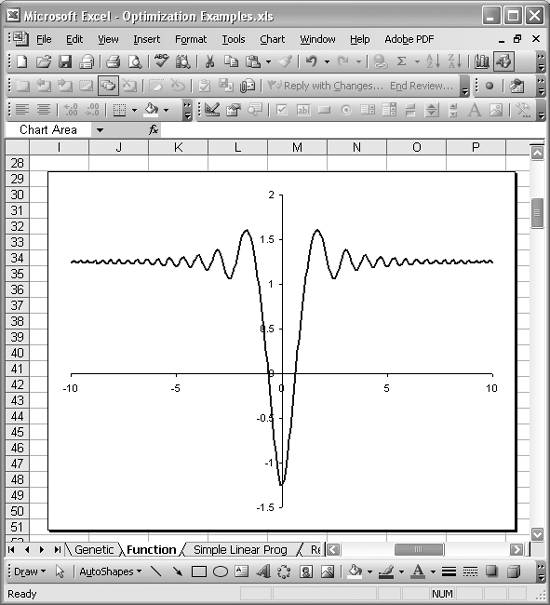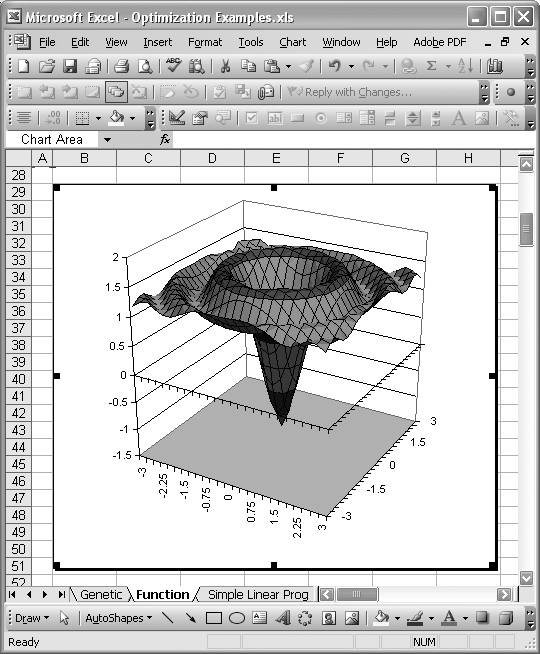The line .Range("Iteration") = n sets the value of cell D60, named Iteration, to n. This provides feedback to you on the status of the subroutine as it runs. The next several lines invoke Solver as described in Recipe 9.3. In this case, the target cell is set to the cell named z, and the cells to change are the ones named x and y. MaxMinVal is set to 2, indicating that we want to minimize the target cell. When Solver is finished, the cell named z in the worksheet named Function, should contain a minimum of the subject function. However, this may or may not be the global minimum. So, we have to check it against the currently stored minimum, zMin.