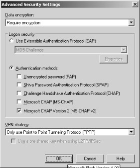 In the Advanced Security Settings dialog box, select Authentication Methods clear the Microsoft CHAP check box, and ensure that only the Microsoft CHAP version 2 (MS-CHAPv2) option is selected. In the VPN Strategy drop- down list, select Only Use Point To Point Tunneling Protocol (PPTP) and click OK twice.