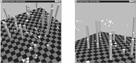 A Flocking Application My Flocking3D application is shown in Figure 22-3. It involves the interaction of two different groups of boids: the yellow flock are the predators, and the orange ones the prey. Over time, the boids in the orange flock are slowly eaten though they try their best to avoid it. Both flocks must avoid obstacles and stay within the bounds of the scene. Figure 22-3. Predator and prey flocks in Flocking3D  The lefthand image shows an early stage in the system, when the predators are chasing prey. The righthand image was taken after all the prey have been eaten, and the predators are flying in groups.  | The code in this chapter was developed by one of my students, Miss Sirinart Sakarin, and me; the code can be found in Flocking3D/. |