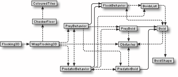 Flocking3D is the top-level JFrame. WrapFlocking3D creates the 3D scene, the predator and prey behaviors, and the obstacles. PreyBehavior and PredatorBehavior can be thought of as flock managers: they initialize the boids that make up their flock and handle rule evaluation at runtime; they're subclasses of the FlockBehavior class. Figure 22-4. The Flocking3D classes  PreyBoid and PredatorBoid represent individual boids and are subclasses of the Boid class. BoidShape is a subclass of Shape3D and manages the boid shape. CheckerFloor and ColouredTiles are the same as in previous examples. |