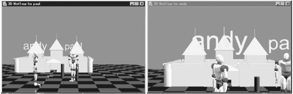 Chapter 32. A Networked Virtual Environment This chapter utilizes the threaded client/server model, which first appeared in the multiplayer chat system in Chapter 30 and now appears in the service of a networked virtual environment (NVE). When clients connect to the server, they appear as a 3D sprite in a shared world filled with sprites representing other users. The scenery is the familiar checkerboard seen in many of the earlier Java 3D examples, along with a castle and some red poles. Users can move their sprites around the world but cannot pass through the poles. Figure 32-1 shows the NetTour3D application being run by two clients. Each window is the clients' view of the shared world, represented by a third-person camera that follows the clients' sprite as it moves. All the visitors use the same robot image, but each user's name floats above their robot. Figure 32-1. Two visitors to the NetTour3D world  Key features demonstrated include: