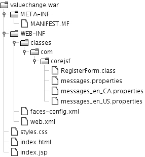 void setPhaseId(PhaseId) Sets the phase identifier corresponding to the phase during which the event is delivered. | The directory structure for the application in Figure 7-2 is shown in Figure 7-3 and the application is shown in Listing 7-1 through Listing 7-5.  Listing 7-1. valuechange/web/index.jsp 1. <html> 2. <%@ taglib uri="http://java.sun.com/jsf/core" prefix="f" %> 3. <%@ taglib uri="http://java.sun.com/jsf/html" prefix="h" %> 4. <f:view> 5. <head> 6. <link href="styles.css" rel="stylesheet" type="text/css"/> 7. <title> 8. <h:outputText value="#{msgs.windowTitle}"/> 9. </title> 10. </head> 11. 12. <body> 13. <h:outputText value="#{msgs.pageTitle}" style/> 14. <p/> 15. <h:form> 16. <h:panelGrid columns="2"> 17. <h:outputText value="#{msgs.streetAddressPrompt}"/> 18. <h:inputText value="#{form.streetAddress}" 19. required="true"/> 20. 21. <h:outputText value="#{msgs.cityPrompt}"/> 22. <h:inputText value="#{form.city}"/> 23. 24. <h:outputText value="#{msgs.statePrompt}"/> 25. <h:inputText value="#{form.state}"/> 26. 27. <h:outputText value="#{msgs.countryPrompt}"/> 28. 29. <h:selectOneMenu value="#{form.country}" 30. onchange="submit()" 31. valueChangeListener="#{form.countryChanged}"> 32. <f:selectItems value="#{form.countryNames}"/> 33. </h:selectOneMenu> 34. </h:panelGrid> 35. <p/> 36. <h:commandButton value="#{msgs.submit}"/> 37. </h:form> 38. </body> 39. </f:view> 40. </html>
