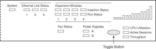 At the front of these chassis is one other unique item: a meter bar, on the right-hand side. The meaning of the meter bar is determined by which of the three LEDs below it is currently lit: CPU Utilization, Active Sessions, and Throughput. By pressing the Toggle button, you can cycle through the three different LEDs, affecting the statistical information shown by the LED meter bar.