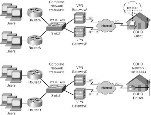 Remote access connectivity has routing issues. The top part of the network shown in Figure 3-5 illustrates this problem. In this network there are two VPN gateways for redundancy. The SOHO client has been configured and lists both VPN gateways, with VPN GatewayA the primary gateway and VPN GatewayB the backup gateway. The two routers, because they are in a different subnet (172.16.1.0/24) than the SOHO client (172.16.2.0/24), could have a static route pointing to VPN GatewayA; however, if this gateway were to go down and the client would connect to the backup gateway, VPN GatewayB, this would create a connectivity problem.