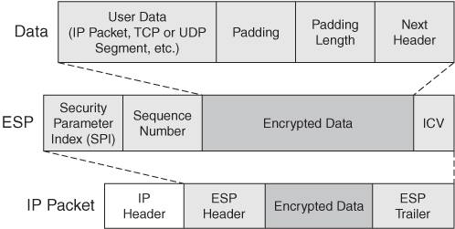 Figure 3-7 shows the process ESP performs on user data to protect it between two IPsec peers. Depending on whether the connection mode is transport or tunnel, the upper layer data or the first IP packet is padded. The padding is used to reduce the likelihood of an eavesdropper guessing what the payload is based on its length. The length is added to this information, then the next header denotes the contents of the payloadthis is the same field used by AH.