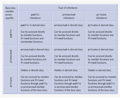 When deriving a class from a base class, the base class may be inherited through public, protected or private inheritance. Use of protected and private inheritance is rare, and each should be used only with great care; we normally use public inheritance in this book. (Chapter 21 demonstrates private inheritance as an alternative to composition.) Figure 12.27 summarizes for each type of inheritance the accessibility of base-class members in a derived class. The first column contains the base-class access specifiers.