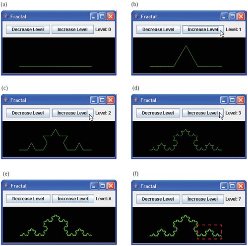 The event handler for the Decrease Level button is registered in lines 6078. In method actionPerformed, lines 6667 retrieve the current level of recursion and decrement it by 1. Line 70 checks to make sure that the level is greater than or equal to 0 (MIN_LEVEL). This is because the fractal is not defined for any recursion level lower than 0. The program allows the user to go up to any desired level, but it is important to note that at a certain point (level 10 and higher in this example) the rendering of the fractal becomes increasingly slower, as there is a lot of detail to be drawn. Lines 7274 reset the level label to reflect the changethe new level is set and the repaint method is called to update the image to show the fractal corresponding to the new level.