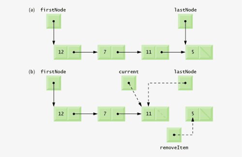 In Fig. 17.8, part (a) illustrates the list before the removal operation. The dashed lines and arrows in part (b) show the reference manipulations.